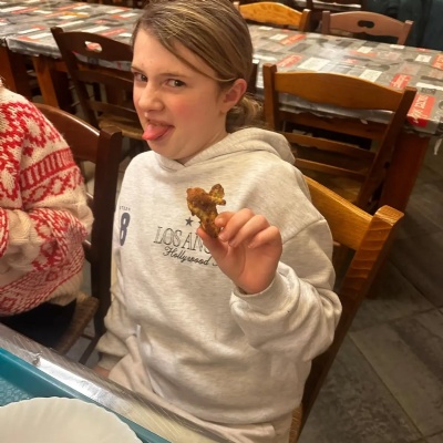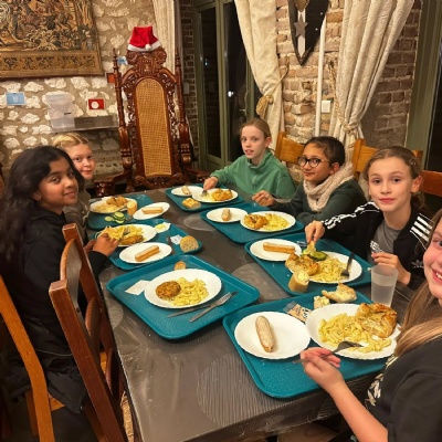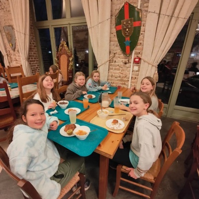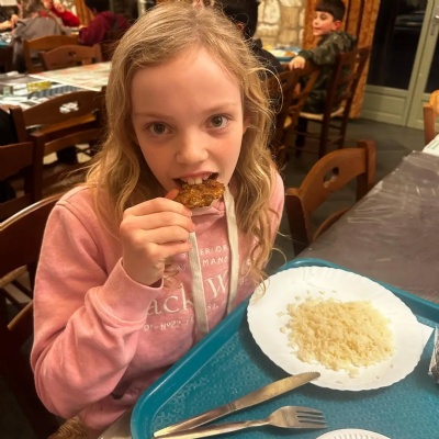 Back at the château, everyone enjoyed tea — including southern-fried frog’s legs for the brave! The evening is being rounded off with songs around the campfire before bed.
